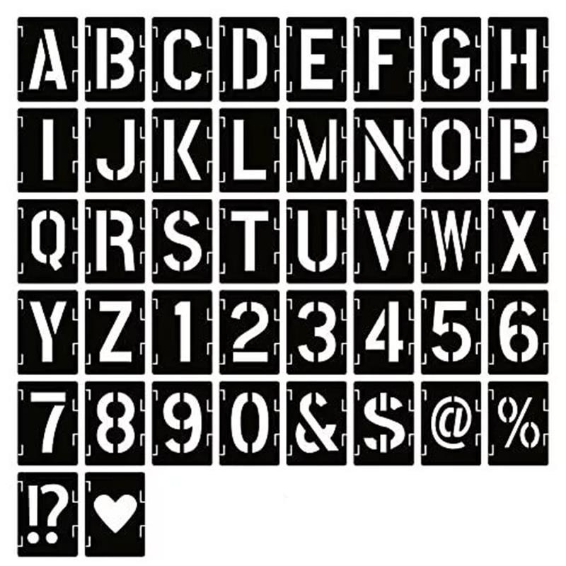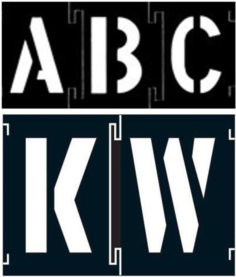 Stensil yang mudah digunakan memberikan peringatan, tindakan pencegahan, dan tanda yang jelas dan terbaca. Karakter saling mengunci dengan menggeser alur yang berdekatan. Mudah dibongkar. Dapat digunakan dengan berbagai cat semprot atau kuas. Huruf meliputi masing-masing 6 A, E, R, dan S; masing-masing 3 dari semua huruf lainnya. Angka meliputi masing-masing 3 dari 0 hingga 9. Juga termasuk 3 spacer kecil, 3 spacer lebih besar, 3 titik, 3 tanda hubung, 3 simbol dolar ($), dan 3 simbol ampersand (&).